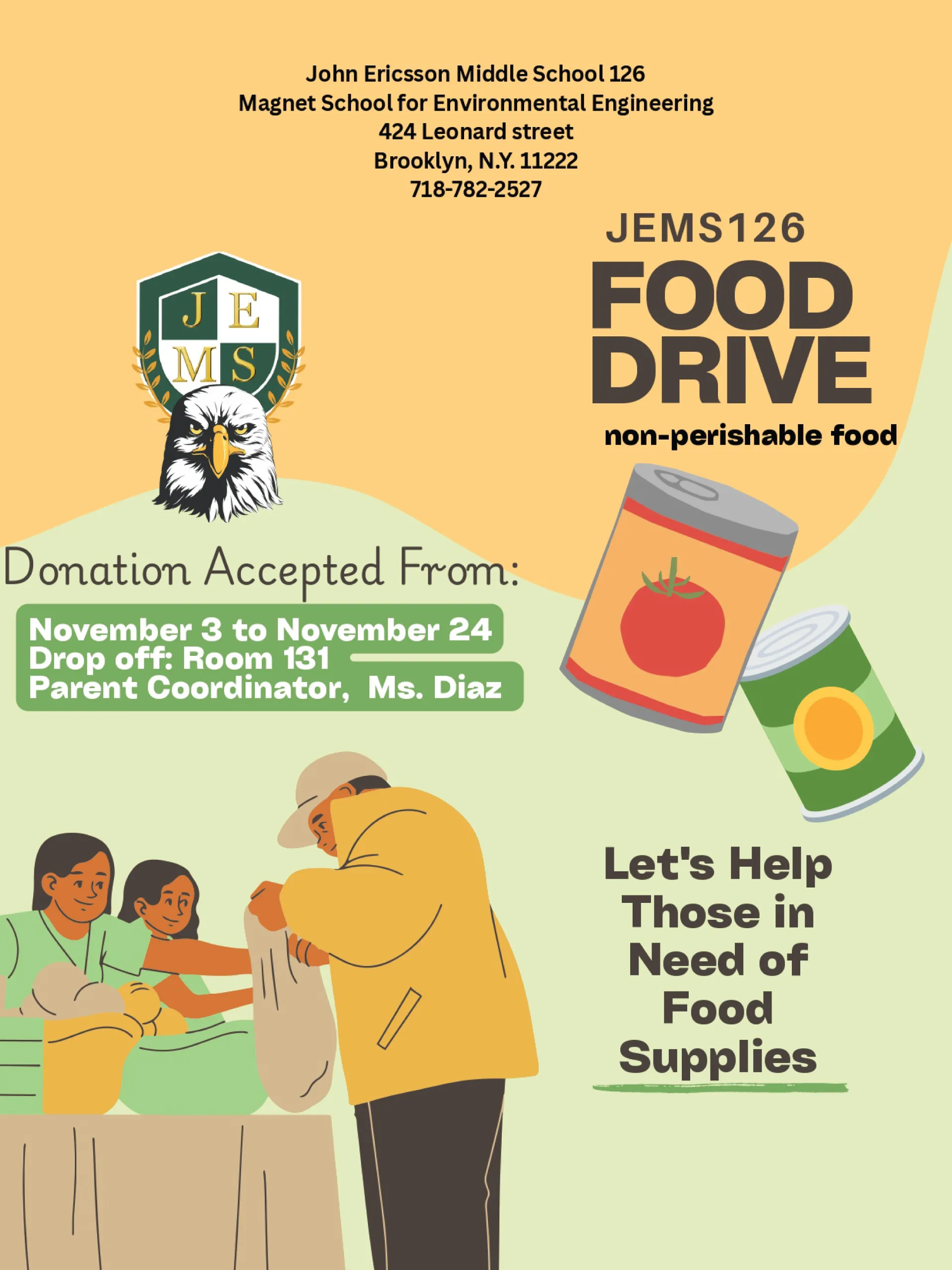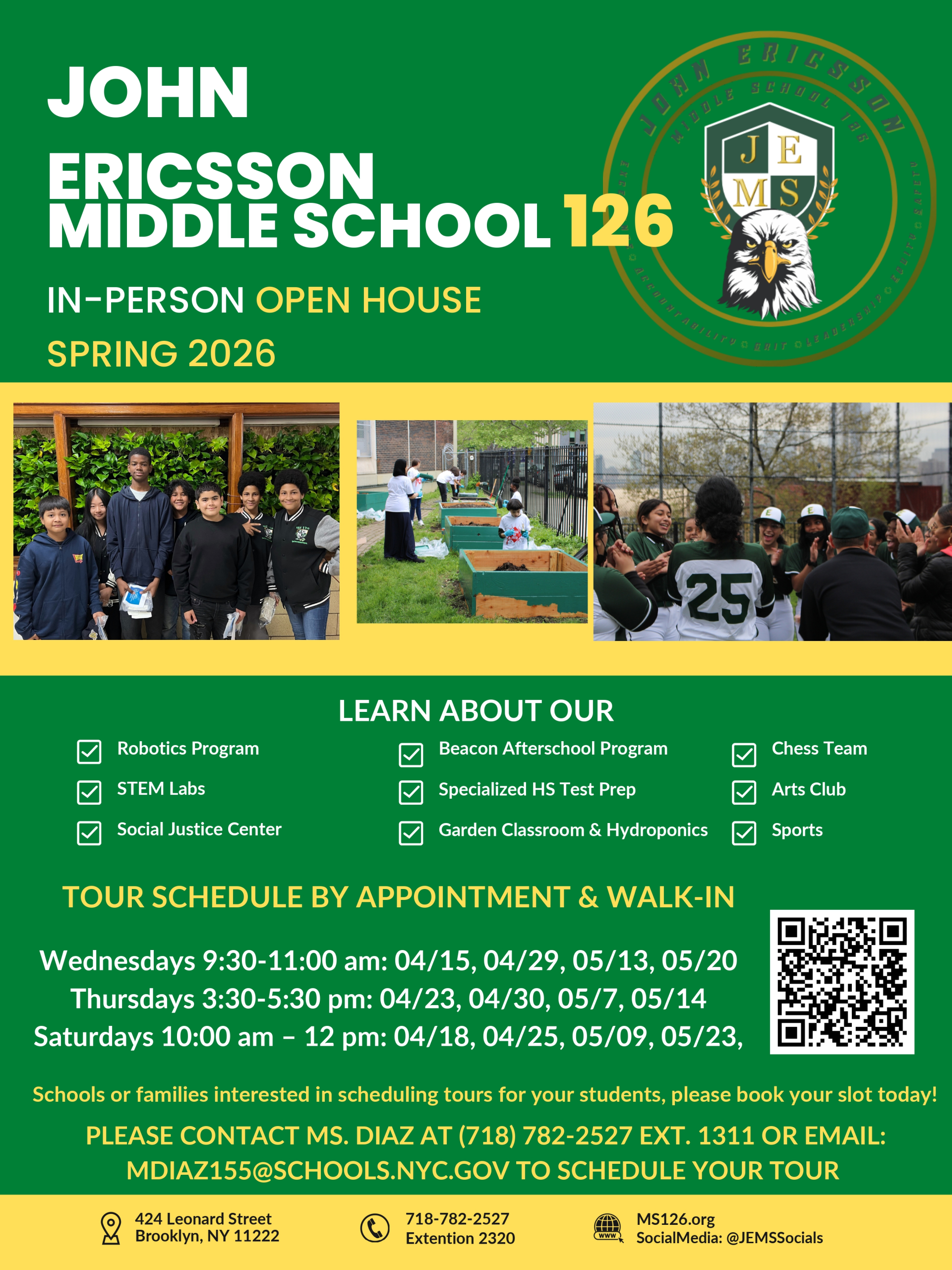 Greetings! We are thrilled to introduce you all to John Ericsson Middle School 126. We are a powerful team of educators, families and students looking to engineer the future of our communities, our city, and our world. We build our educational program to support the whole child with rigorous academic courses as well as social emotional learning and community building. With a particular focus on science, math and technology, students participate in hands-on, problem based learning and create solutions to real world challenges.